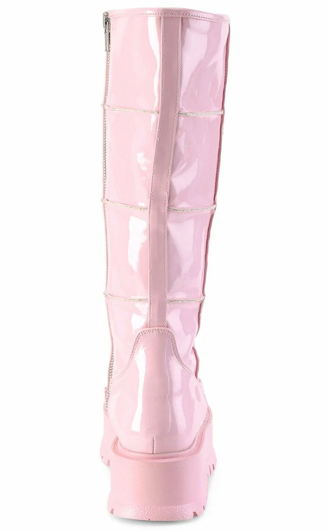 Shiny, holoΒ vegan leatherΒ knee length boots with patching and a mini flatform.
