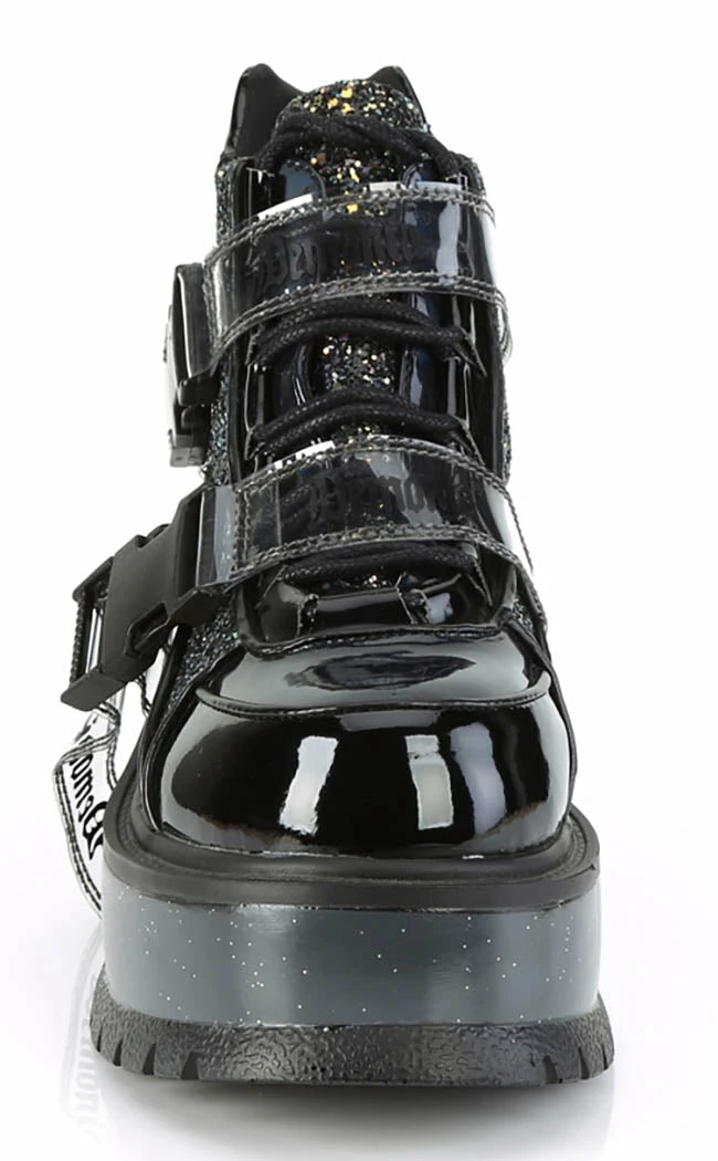 Get glittery and stompy in the SLACKER-50 ankle boots! These lace-up sneaker-look booties have a comfortable 2-inch flatform and feature glitter panels and snap buckles for a bit of Y2K flair.