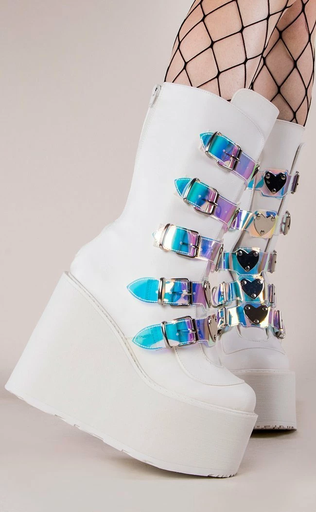Swing your way into the club with this series of platform wedged boots and shoes, with buckles and straps and decals galore!