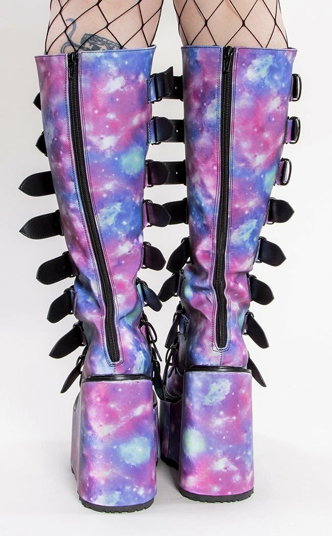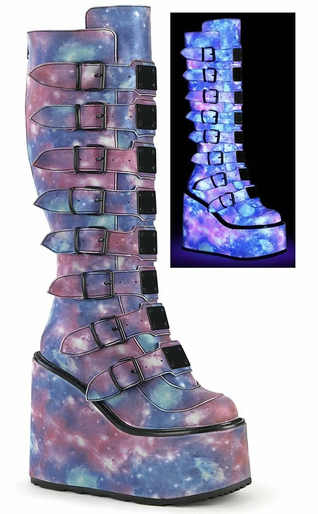 Swing your way into the club with this series of platform wedged boots and shoes, with buckles and straps and decals galore!
