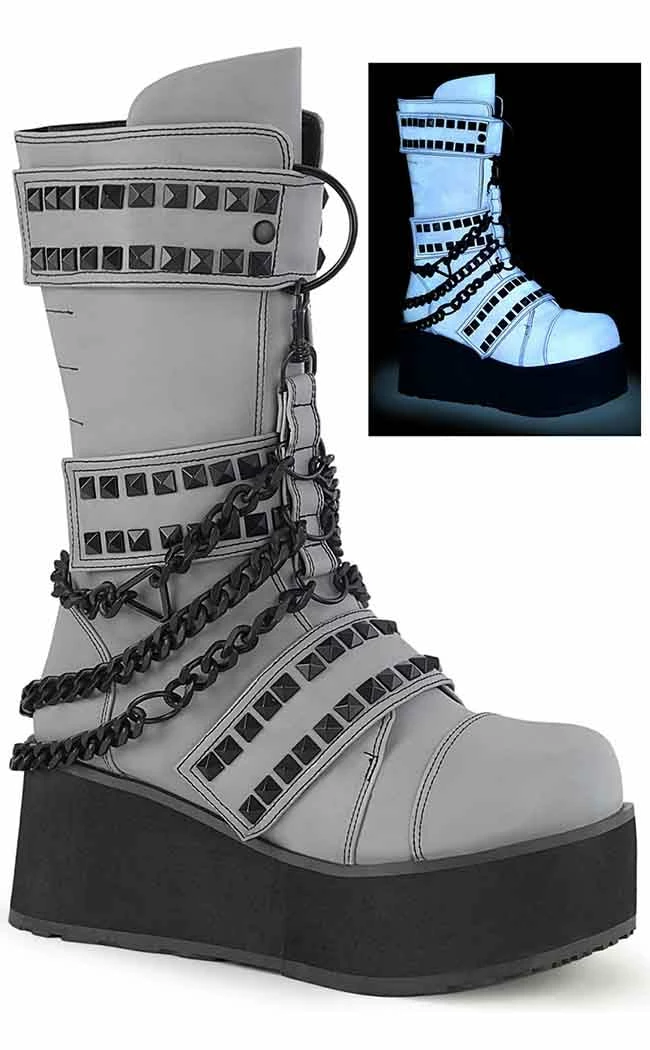 Trashy shoes for trashy peeps! Express your love of all things camp and stompy with these club ready clompers: covered in studs and wrapped in grey reflective vegan leather.