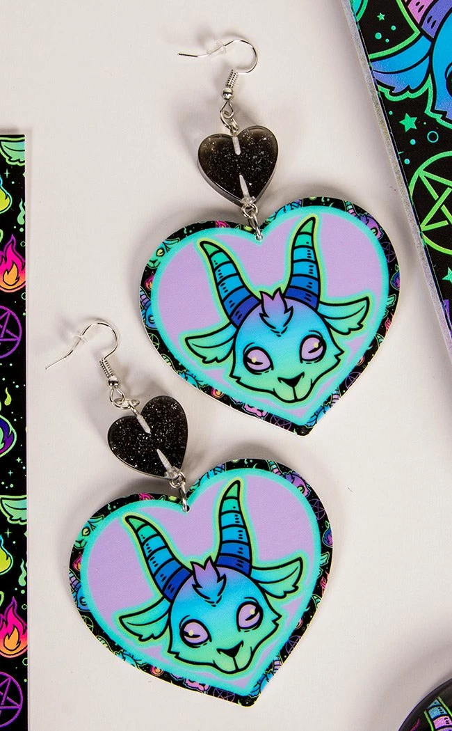 Get yer neon demon on with these darkly adorable earrings!Β Heart-shaped pendants feature an ombre goat demon with occult patterns on the reverse.Β Crowned with a black glitter heart, these babies will add instant drama to any outfit!