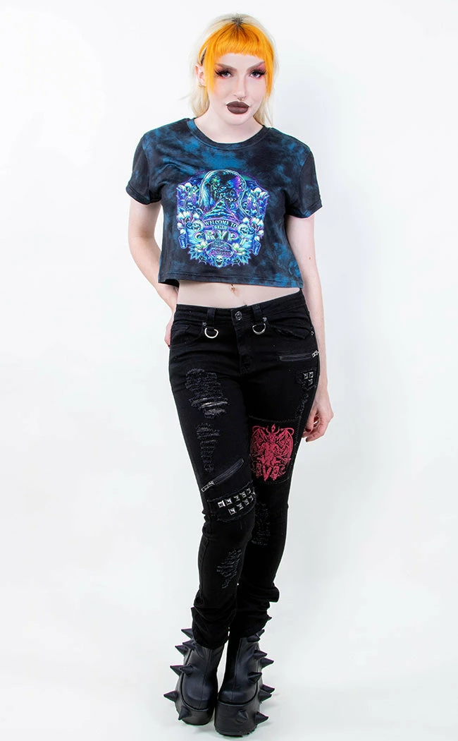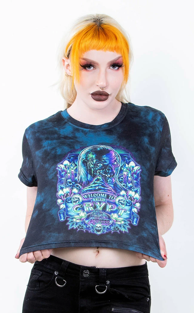 Create yer own horror story with the Crypt Keeper Tee. This soft crop features everyone’s favourite Crypt Keeper welcoming you to his home against a foggy and eerie blue background.