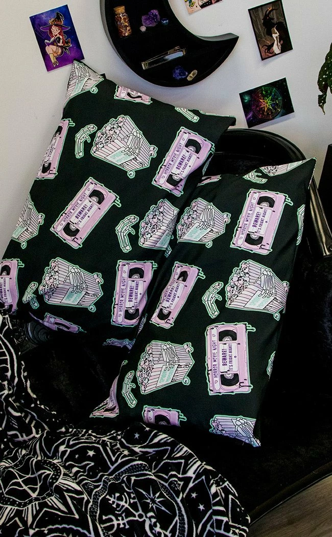These pitch black pillows feature a pattern of pastel VHS tapes and spooky skull popcorn buckets for a retro snooze in cinematic comfort.