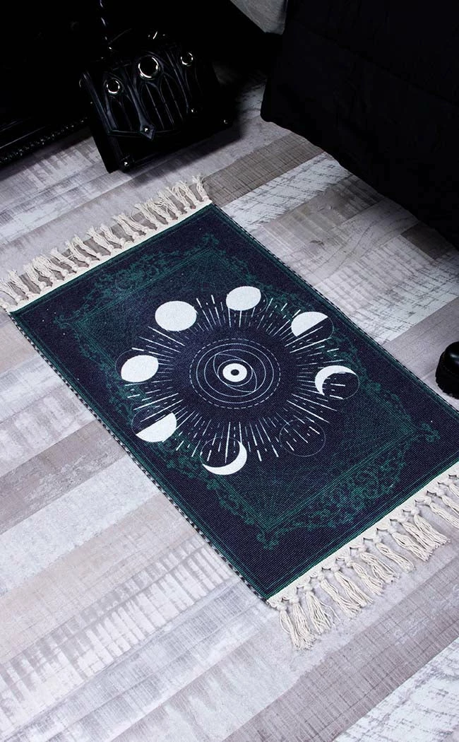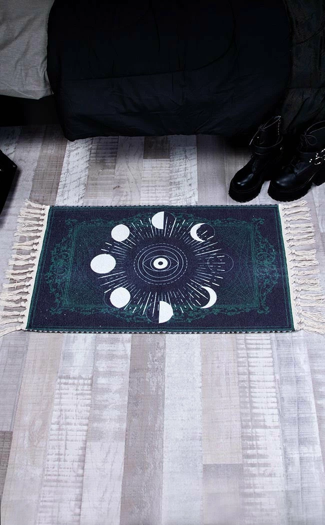 Sort the guests from the proselytisers with the Evil Eye Doormat! This wicked welcome mat features a large eye surrounded by the phases of the moon, both of which sit against a frame complete with spiderwebs. With fringes on opposite ends and non-slip backing, lay this mat out in front of any door to freak out passersby and welcome your fellow witches!