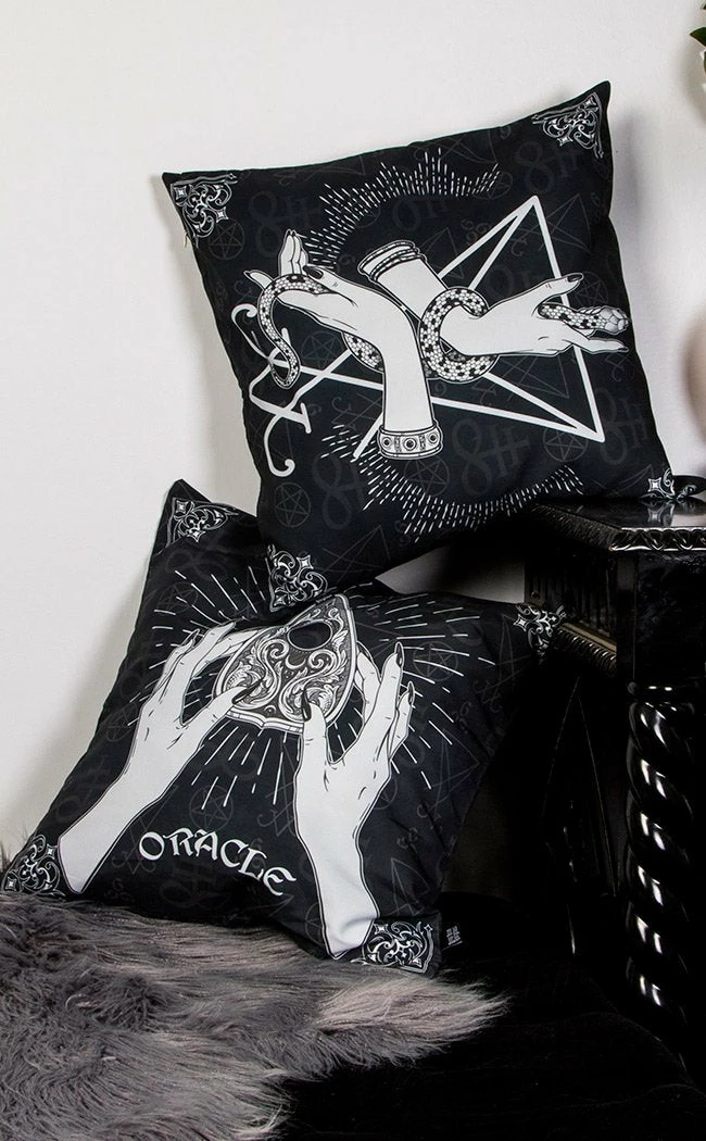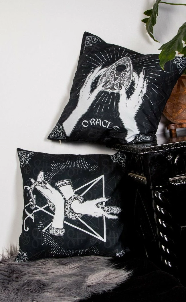 Bring some class to your crypt!Β This set of 2 large cushion covers is perfect for your bed or lounge.Β Each side features two distinct art prints: one of hands holding a snake and the other of hands holding a planchette.