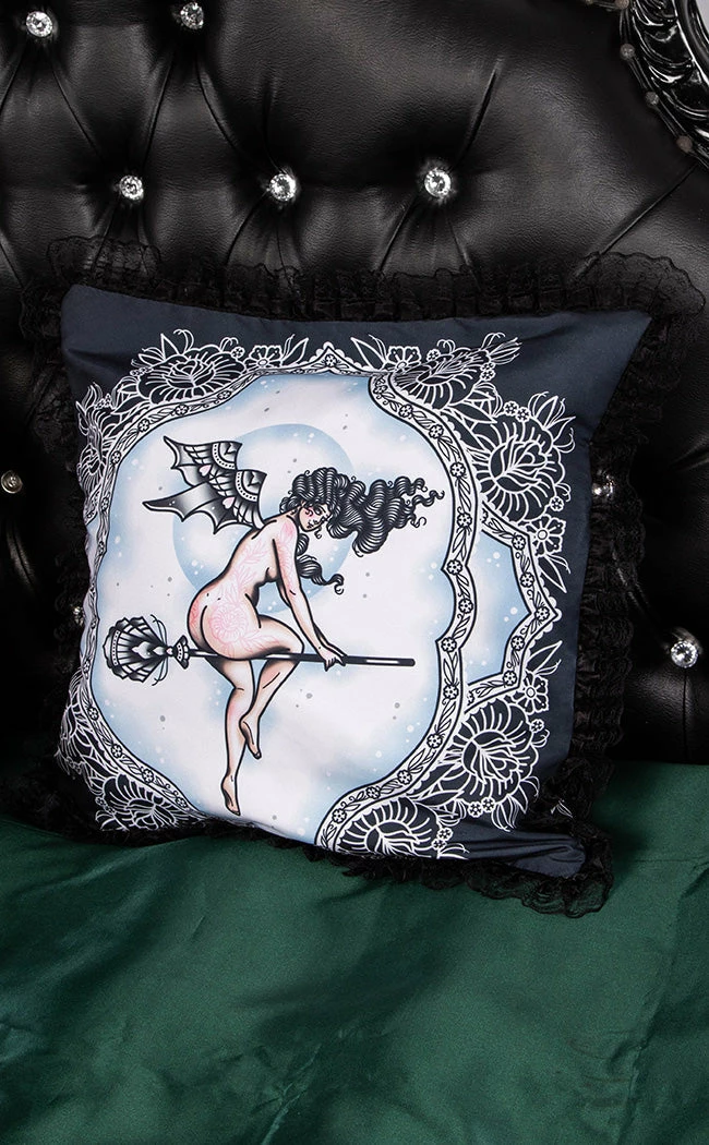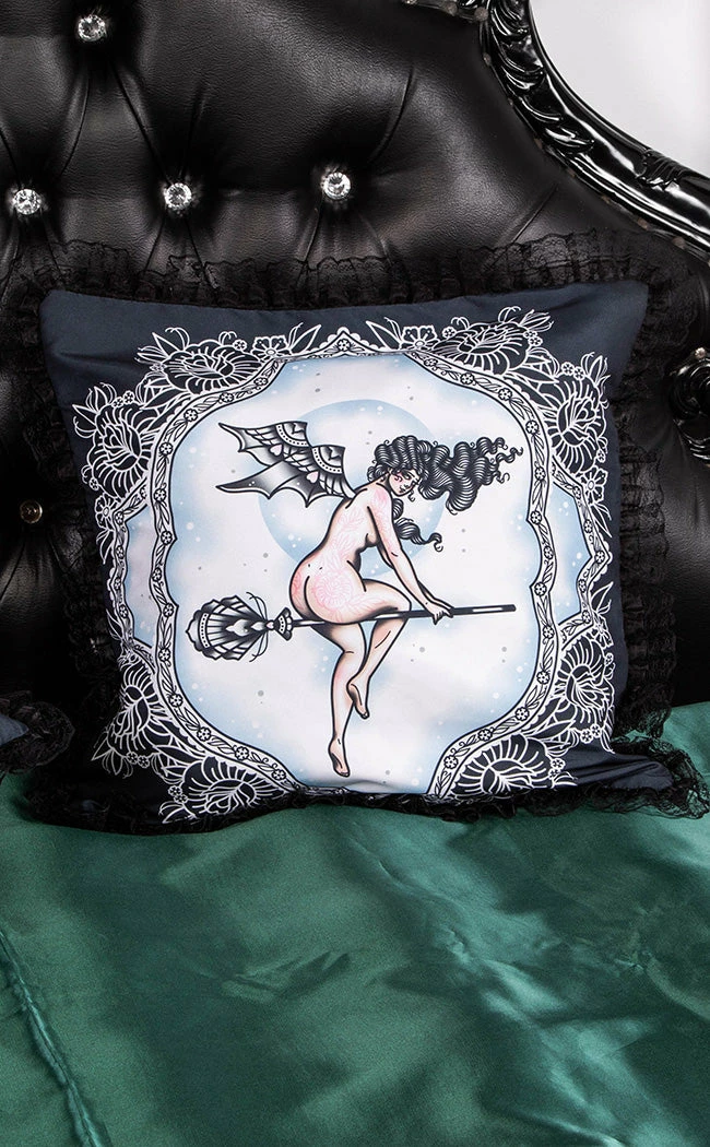 Make your decor scheme tastefully horny with the Send Nudes Cushion Slip! Decked out with tattoo style art, both sides feature a sexy witch feeling her powerful self and surrounded by a fancy af border. The whole affair is trimmed in frilly lace so you can fancy up your lounge, bedroom and boudoir.