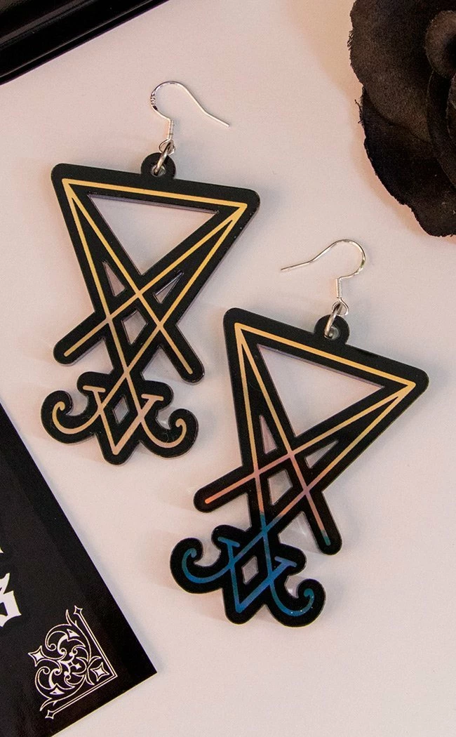 Behold the Sigil of Lucifer Morningstar, immortalised for eternity in holographic glory!Β His oversized mark hangsΒ from hook fastenings toΒ bathe the wearer in unholy light and frame the face.Β Β