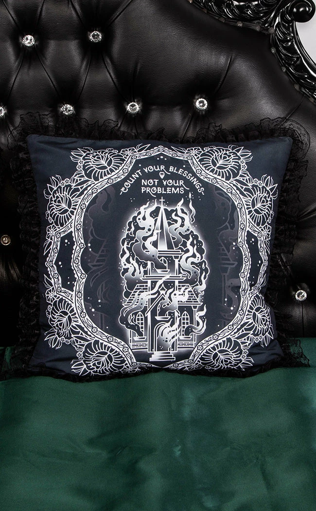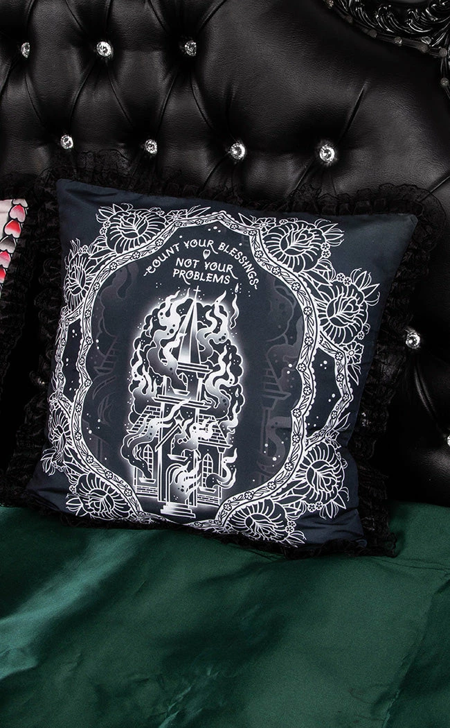 A daily mantra to remind you of your fortune! This cushion depicts a burning church in a monochrome print with the phrase “Count your blessings, not your problems”, finished with a black lace trim. Super soft and super stunning, thisΒ slip looks spectacular on couches, chairs, beds and graves.