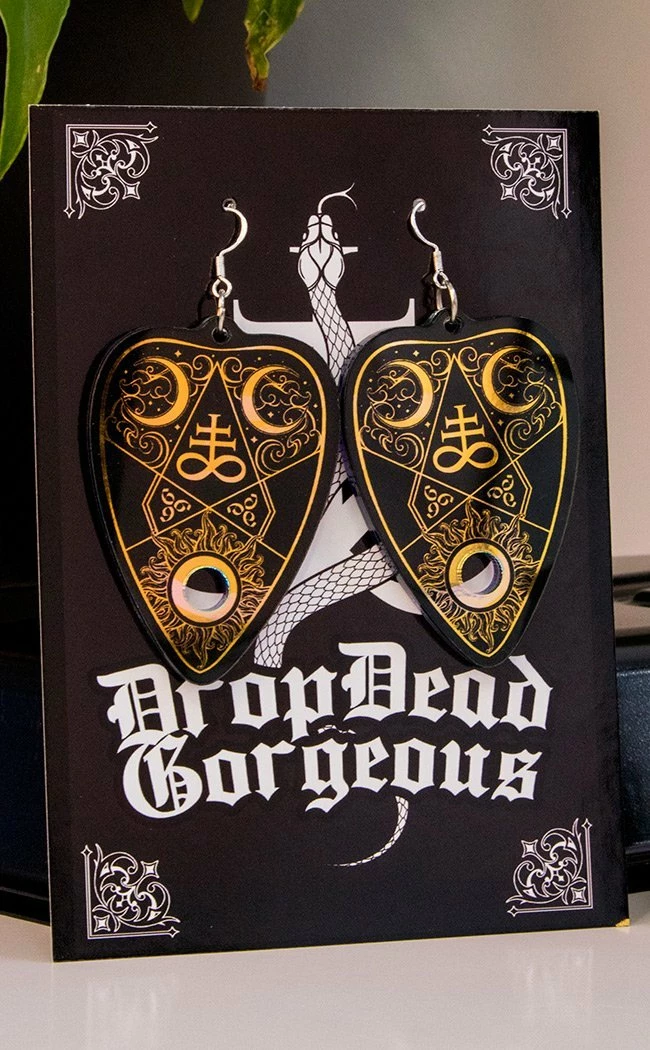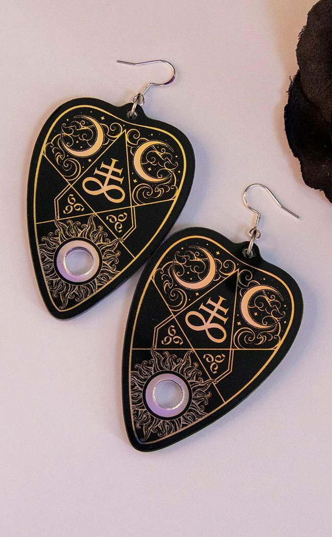 AΒ piece of occult eleganceΒ for theΒ sprit medium who likes to accessorise.Β TwoΒ large planchette bearing arcane sigils hangΒ from hook fastenings, all enclosed in an aura of holographic shine.