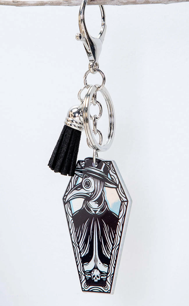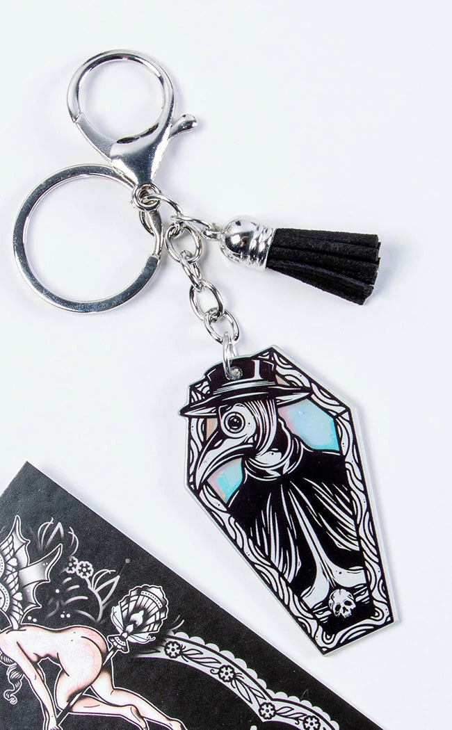 Deck out your bag with the delightfully morbid The Cure Keychain! This keychain has a coffin-shaped charm featuring a plague doctor with a holographic finish for that xxxtra air of rainbow miasma. The chain also comes with a cute black tassel and lobster clast for versatile clipping optionsÂ