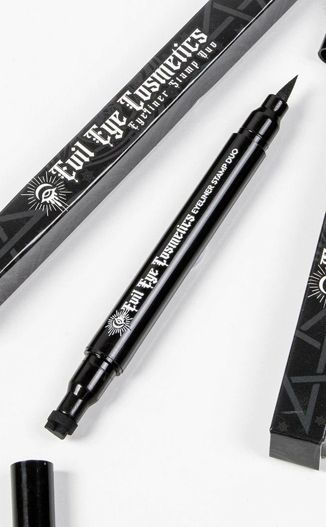 Create stunning looks in a snap with the Wicked Ink Eyeliner Stamp Duos! TheseΒ pens are double-ended:Β one is a felt tip liner for fine details while the other endΒ has an easy to use heart-shaped stamp.Β Simply press it lightly to yer skin and go! With our signature Stiletto Sharp liner formula, you’ll have water and smudge-proof looks to last you through the day and night.