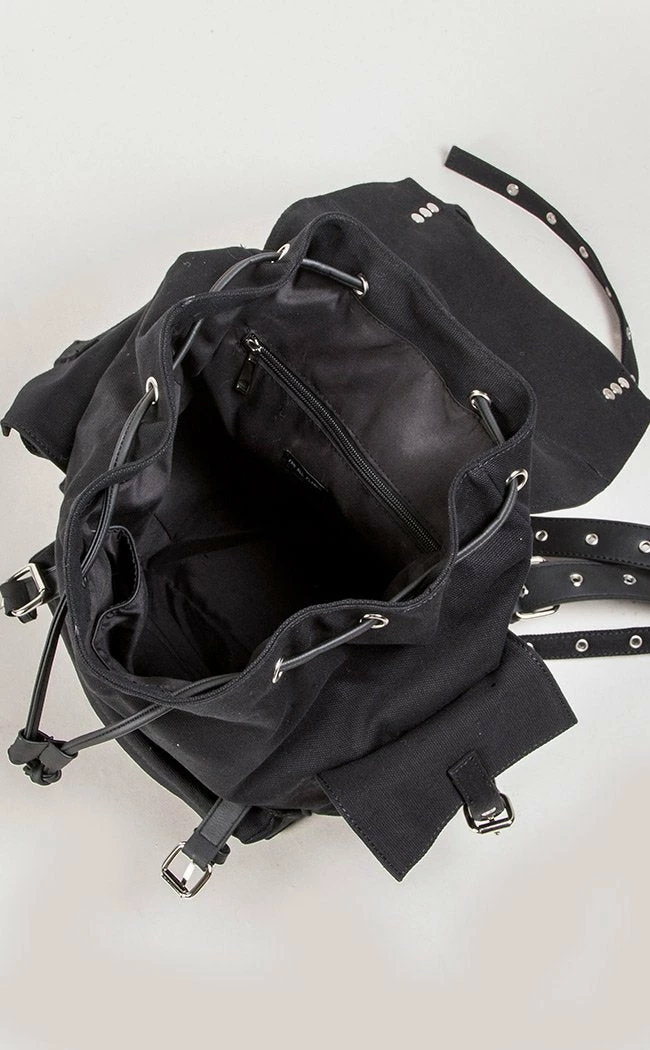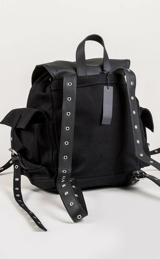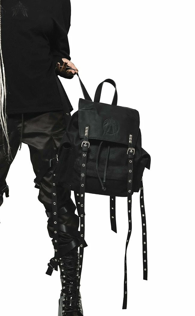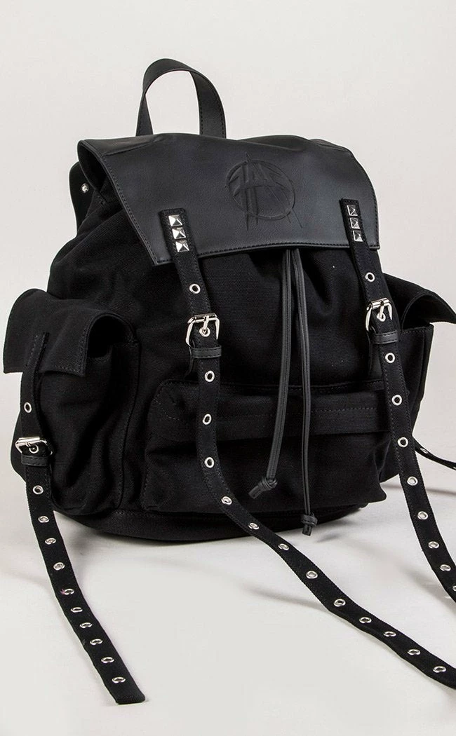 Keep your shiz together inΒ heavy tactical gear; eyelet straps hang down from the flap and spacious side pockets.Β The flap is embossed with the Fan All Flames logo and studded.Β The bag itself secures with pull ties so you can fit everything you need for a day trip or dark academia.