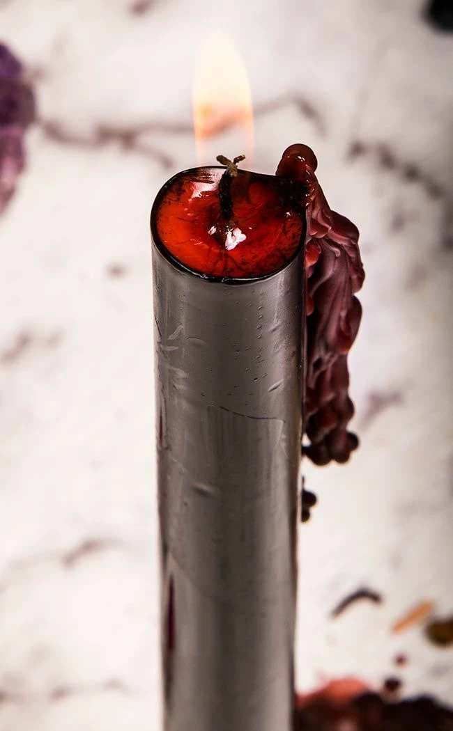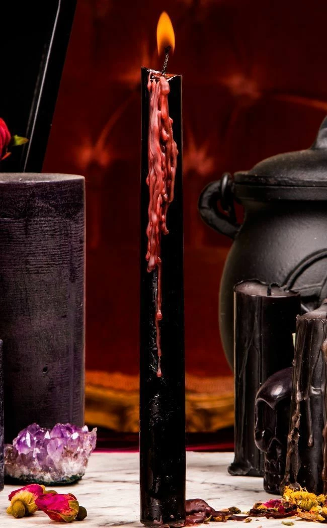Set of four black tapered dinner candles that bleed red when lit!