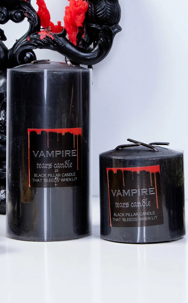 Set a sinister mood with these Vampire Pillar Candles! This chunky 3 wick beauty looks like an innocent black candle at first glance, but light it up to start the show and watch it BLEED!