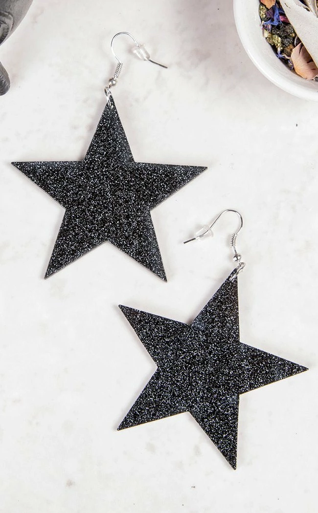 Look to the stars for the answers.Β These huge, acrylic earrings are covered in glitter-a galaxy contained in a star!