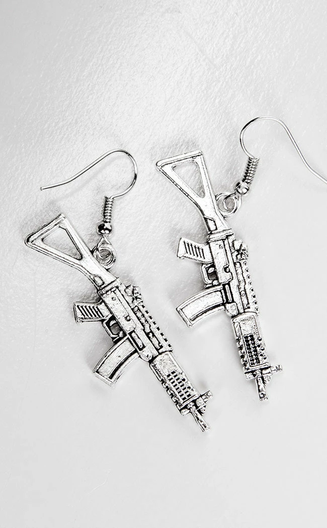 Look effortlessly badass in theΒ Armed & Dangerous Earrings! These babies are shaped like assault rifles, finished in silver and hanging from hook fastenings.