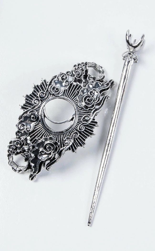 Let the sky fall on your shining locks with the Celestial Hair Pin! This beautiful pin features a sheath that forms a shining moon and a clouded sky that secures with a pin-shaped to look like a staff.