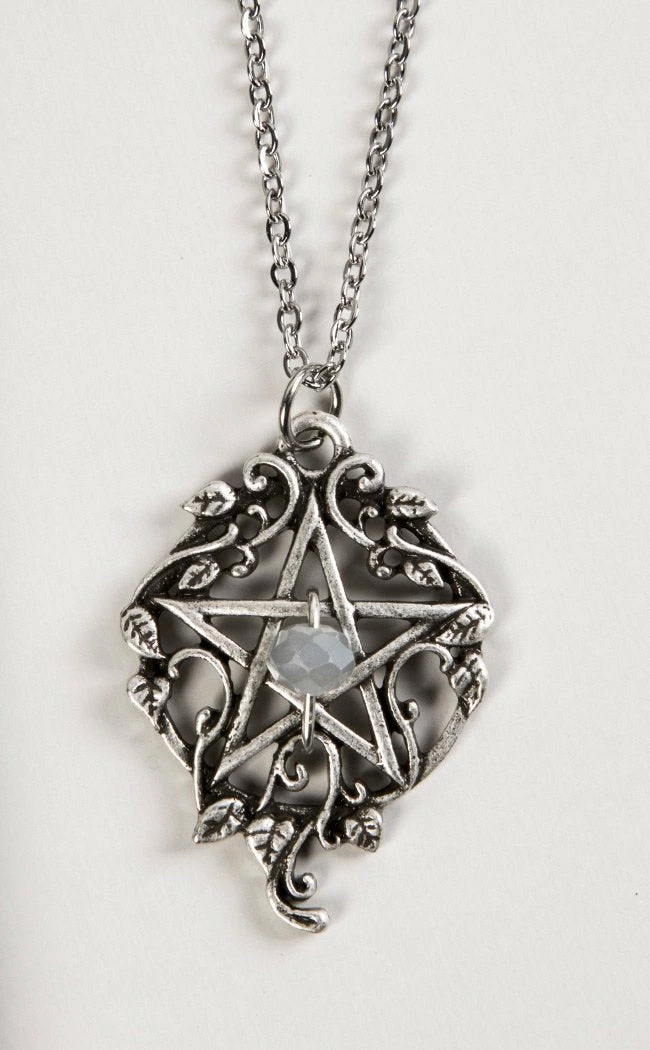 An upright pentagram forms this pendant, surrounded by filigree and touches of ivy as if plucked from an overgrown ruin.Β At the centre sits a smoky, grey bead for a touch of elegance formed from cool mists.