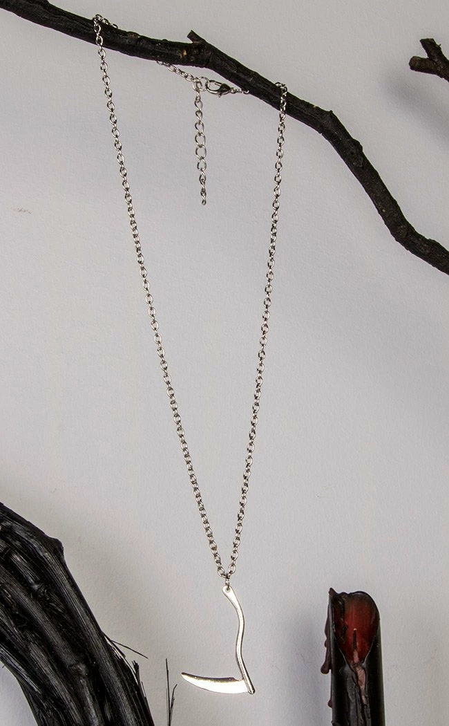 This deceptively simple pendant necklace is an easy way to dress a look up or down.Β An inverted scythe hangs from a delicate silver chain for stylish reapers and omens of doom alike.