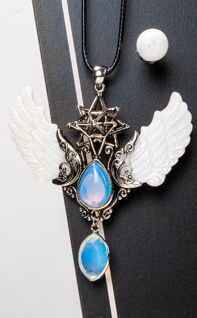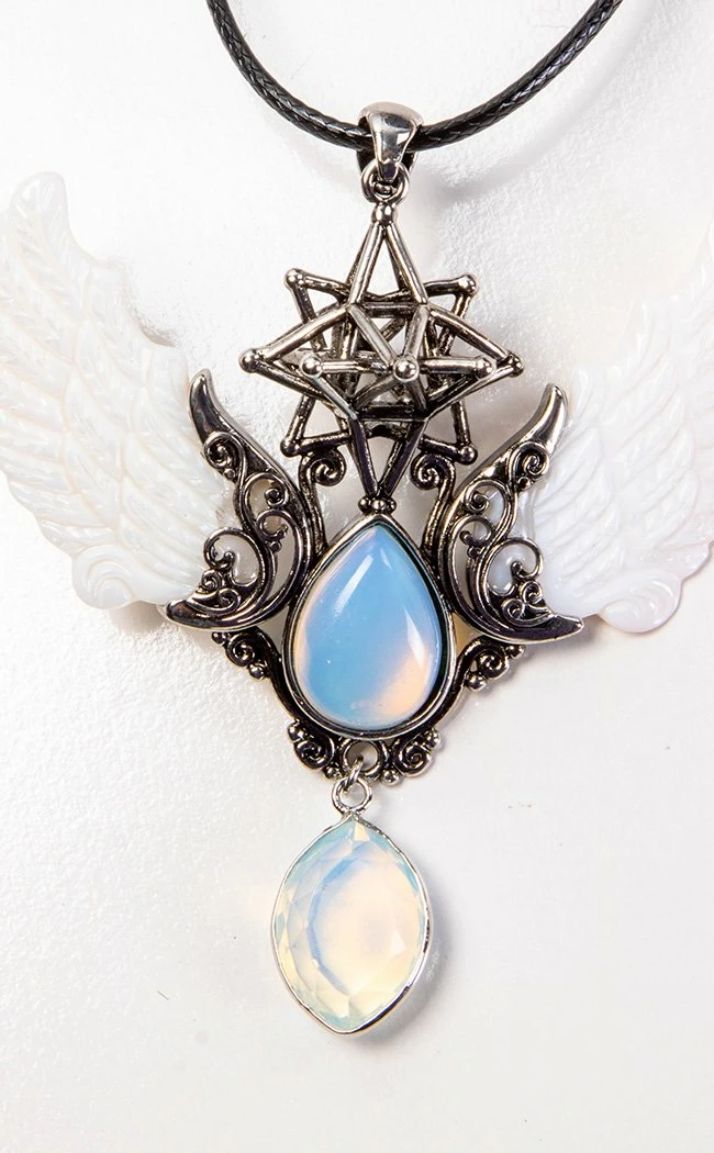Cloak yourself in the essence of a divine being.Β This statement pendant features two pearly white angel wings stretching out from a teardrop-shapedΒ moonstone crystalΒ fixed in intricate silver findings.Β A matching faceted pendant hangs below the set.Β The wings are crowned with a geometric star, creating a beautiful piece that will cast heavenly light on plunging necklines.