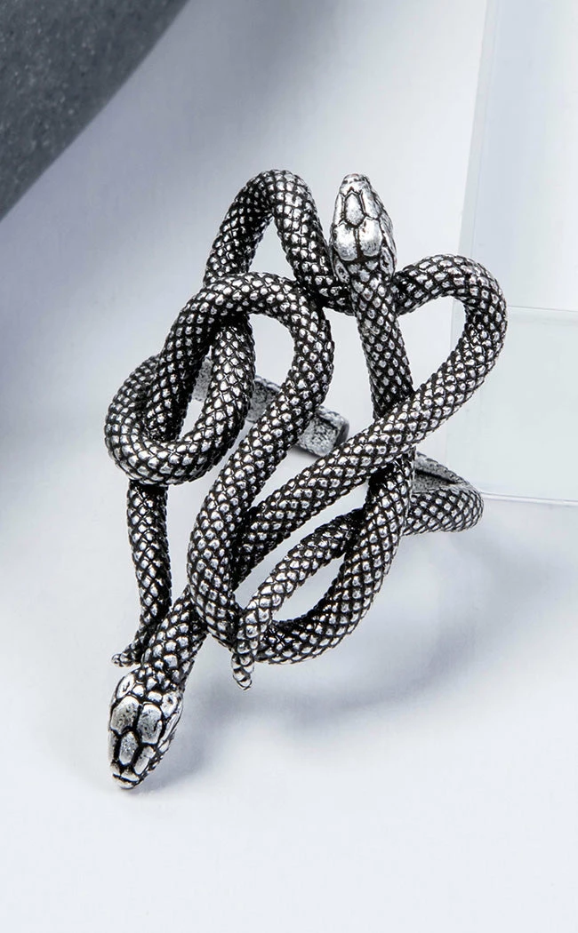 Couple goals! The Venomous Pair Ring features two snakes coiling around one another to form an oversized motif, finished in antique silver.
