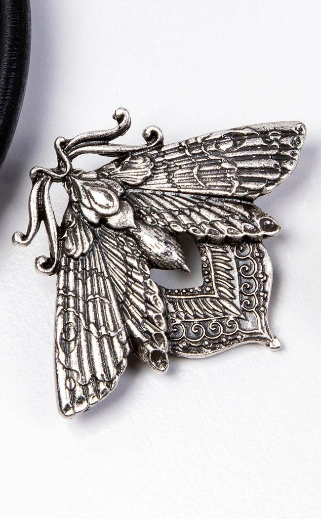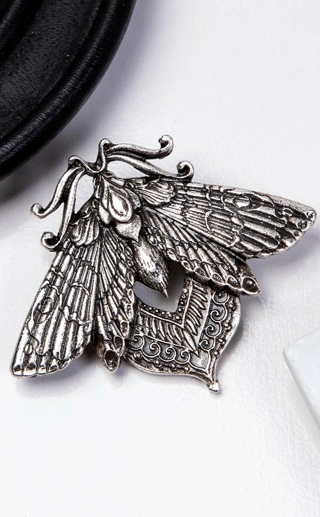 This elegant moth sits with its wings folded, impressive antenna curling about its head. Lacy baroque detailing at the bottom enhances the entire design, finished in shining silver.Β