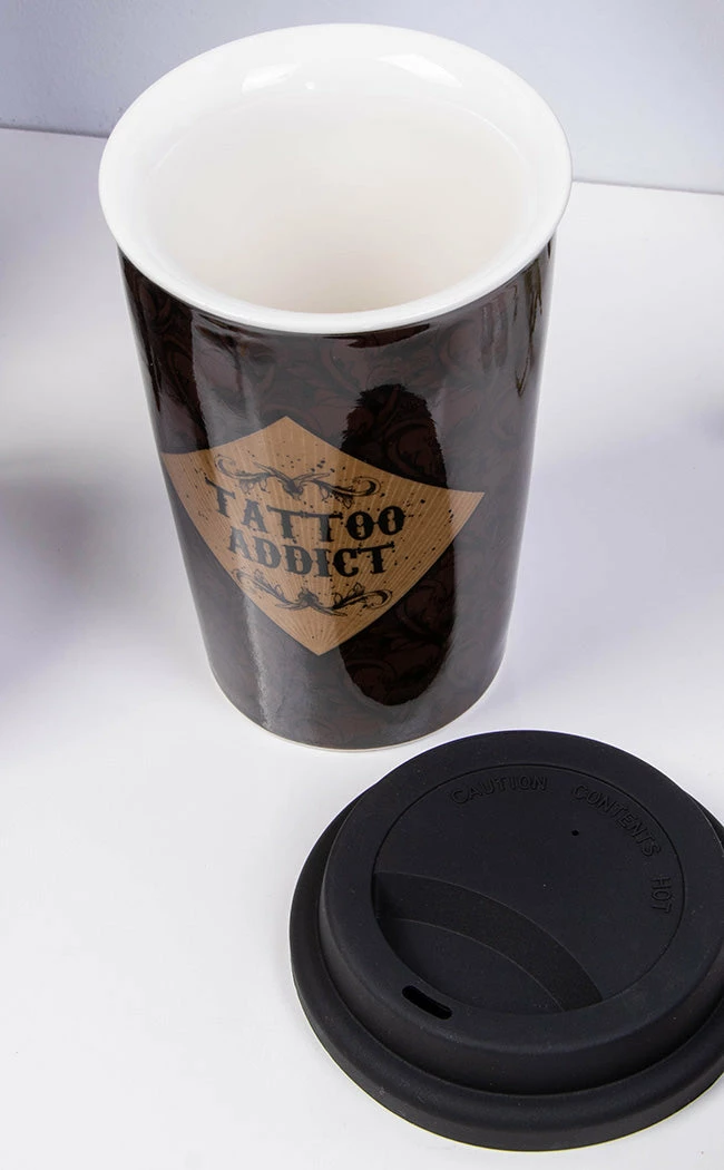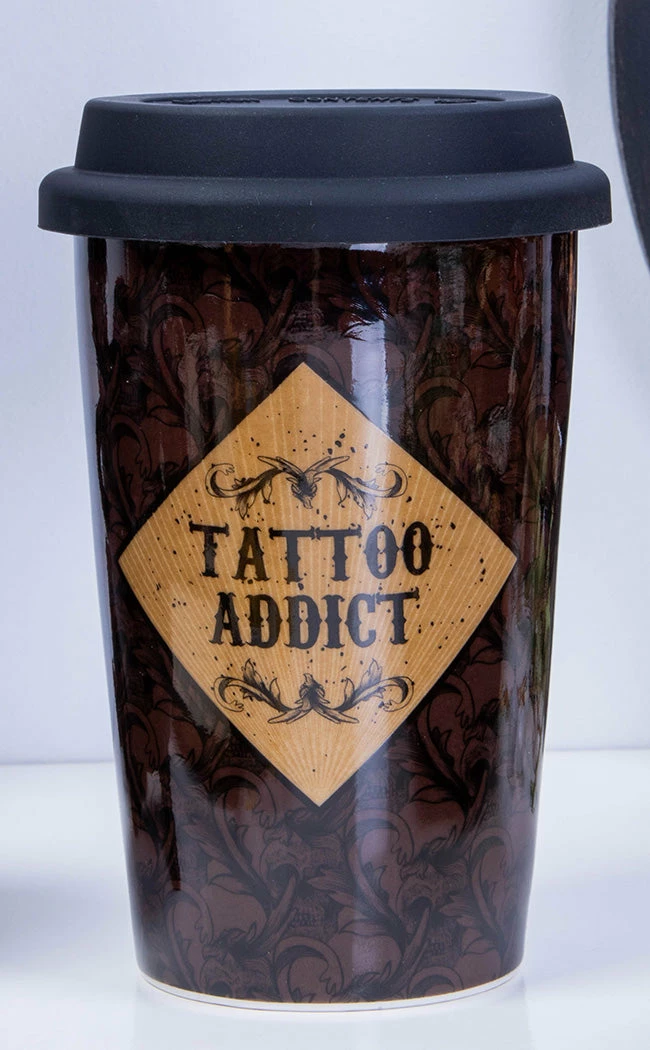 Save the environment and show off yer love for ink! This travel mug is made with double-walled ceramic, designed to keep your drink hot and your body caffeinated for that early morning grind. The design features a baroque pattern and the words “Tattoo Addict” along with a silicone lid.