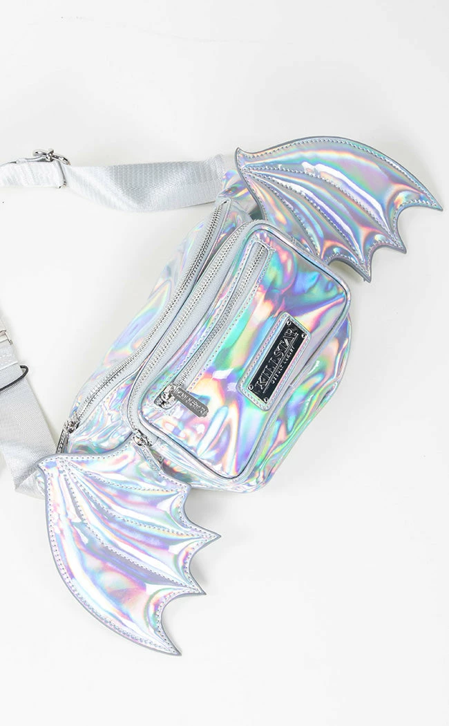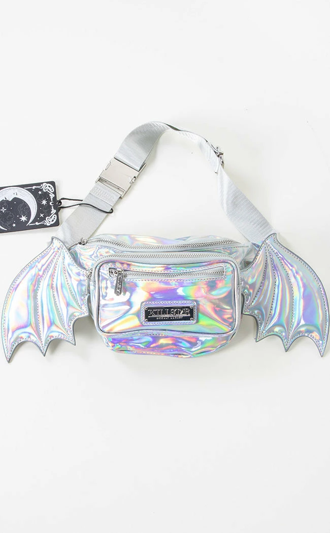Grab your sh*t and go with this holo statement piece! Both the main compartment and front pocket secure with zips, so you can thrash and flail without losing yer trinkets. Two shining bat wings spread out from the sides so you can slip this baby on and fly the day away.