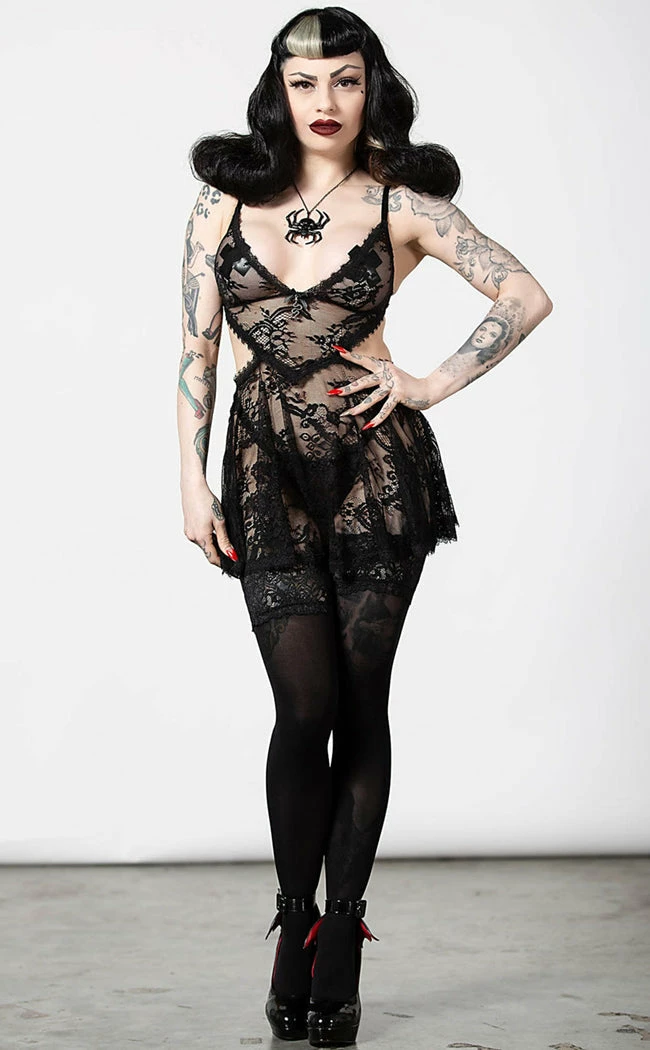 Resurrect your slumber threads with the Afterlife Lace Nightdress! The softest lace conjured from pure darkness slinks around your beautiful body, forming cutouts at the waist, adjustable shoulder straps and a hook and eye closure at the back.
