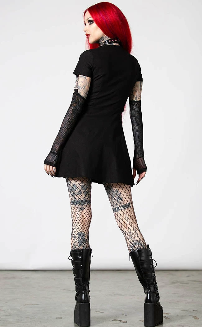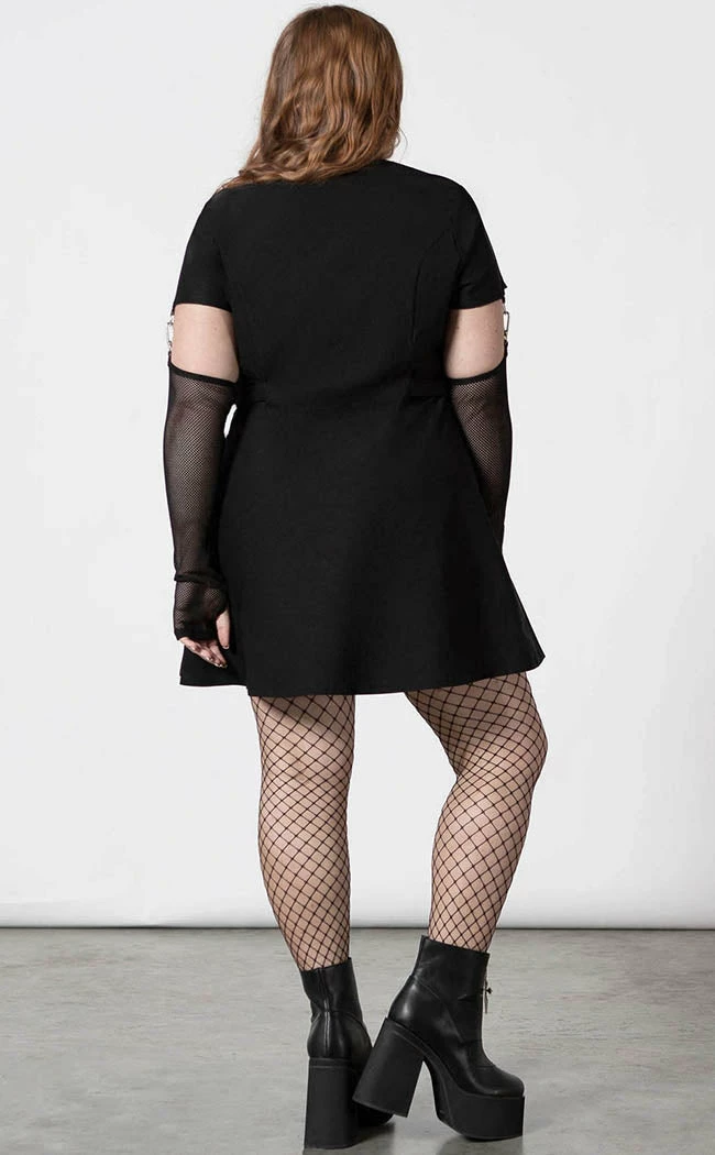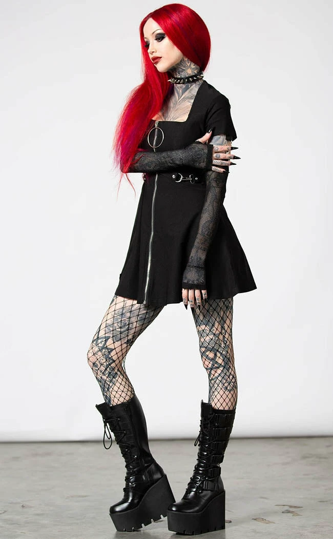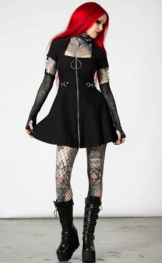 Show off yer apathy in the Anti Everything Zip Dress! Super soft fabric hugs yer figure for the perfect fit, forming a low, square neckline, cap sleeves detachable mesh arm warmers. Wicked details like the harness waist, full-length zip and large O ring complete the look.