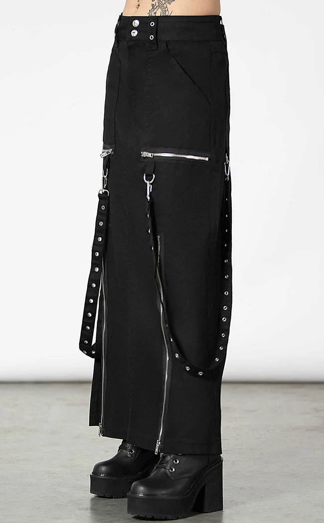 Emerge from the darkness in the Arya Maxi Skirt. The soft cotton twill fabric is decked out in delectable details, including zips, detachable bondage straps and fully functional pockets. The skirt secures with a zip and double button-up fly so you can slay all day in comfort.