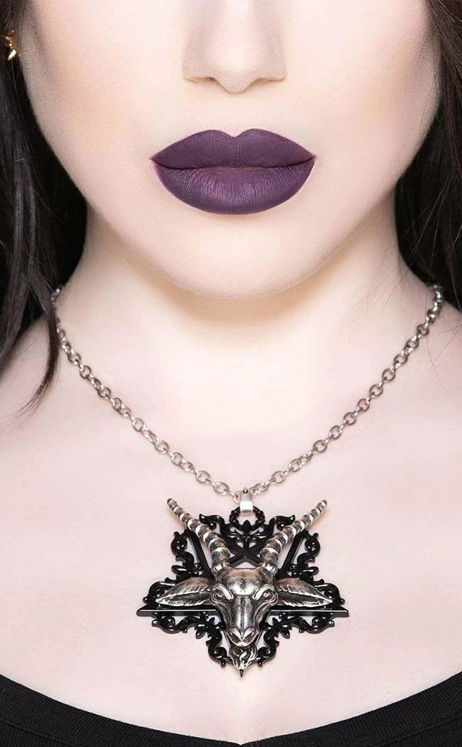 Hail yourself!Β A silver BaphometΒ head sits upon a contrasting black inverted pentagram surrounded by intricate filigree.Β For the goth who’sΒ worshippingΒ all that is stylish and unholy.