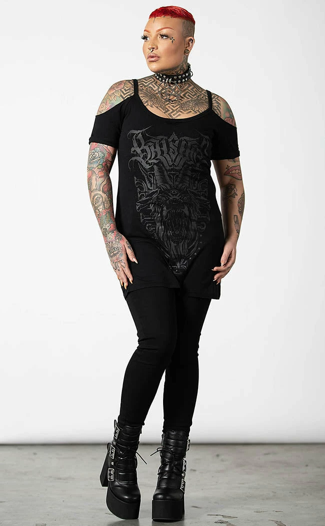 Look creepy cute in the Bellow Distress Top! This longline top is made with a soft cotton jersey for comfortable all-day wear, featuringΒ an eyecatching shreddedΒ bardot neckline. The black on black print depicts the Killstar logo in a meta font and a screaming goat demon to match yer evil mood.