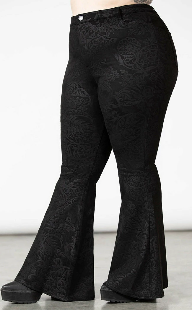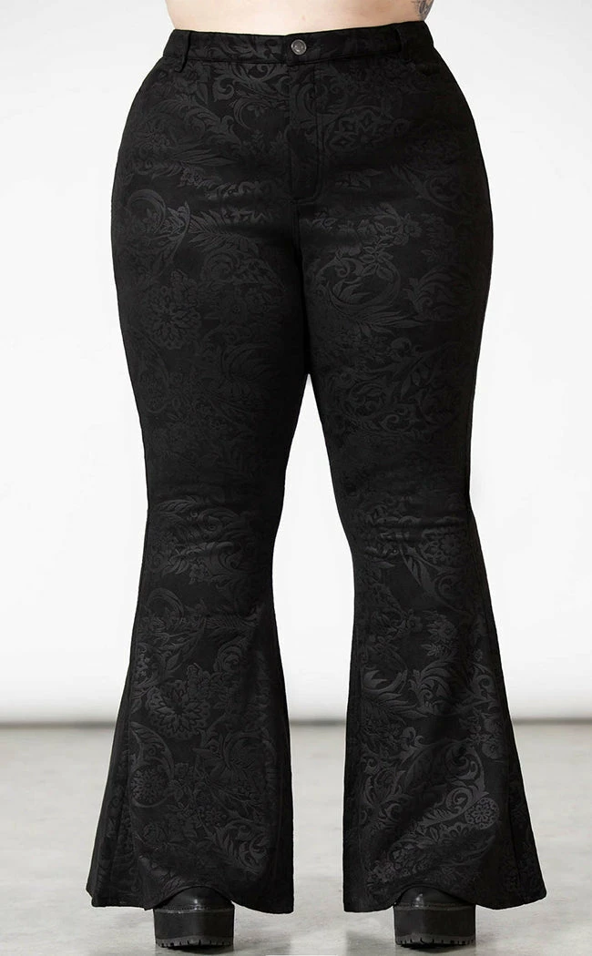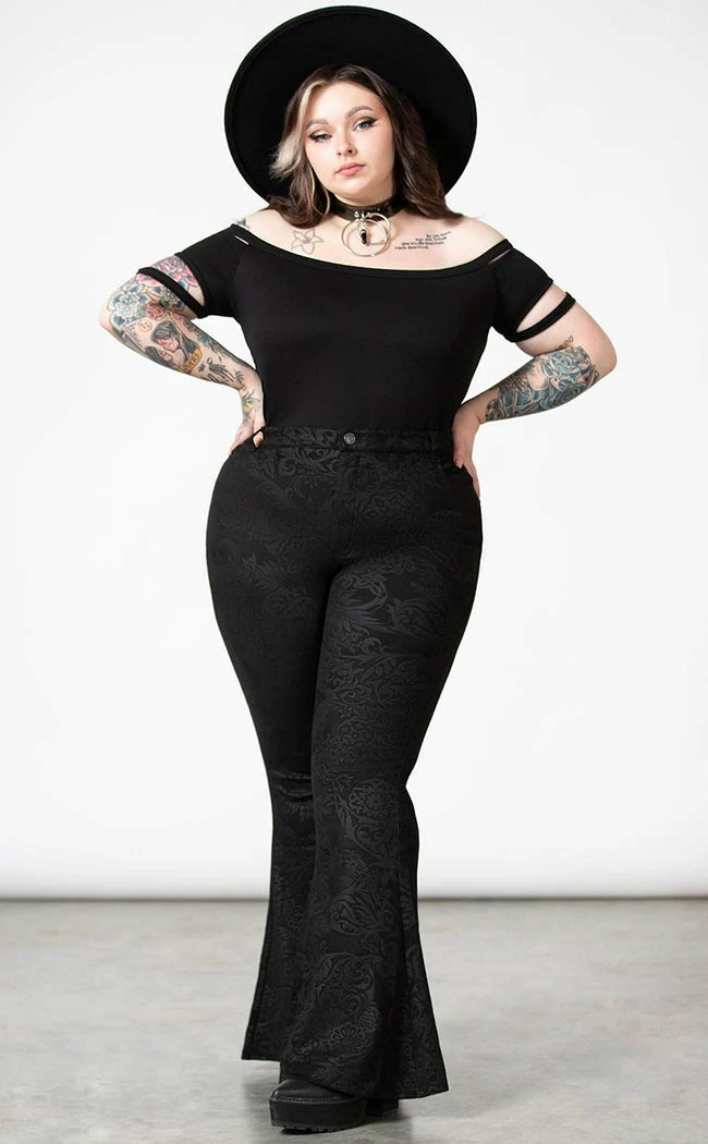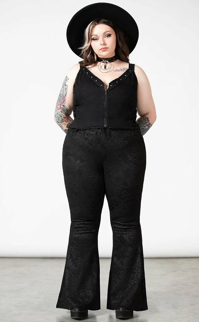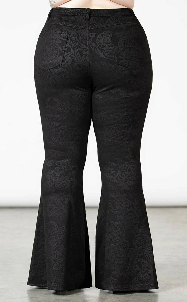 The Black Lily Bell Bottoms are the perfect companion for strolling through overgrown gardens! Light stretch faux suede forms these gorgeous flares, embossed with intricate patterns that’ll have you feelin’ witchy n’ fancy. The pants secure with a button and zip closer and also come with belt loops and pockets