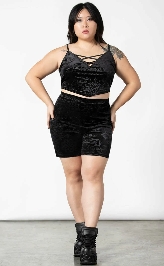 Feel your best self in the Blasphemia Strappy Top! Custom burnout velvet forms this strappy crop, featuring a pointed hem, a V neckline, statement chest straps and super stretch fabric that creates the perfect fit!