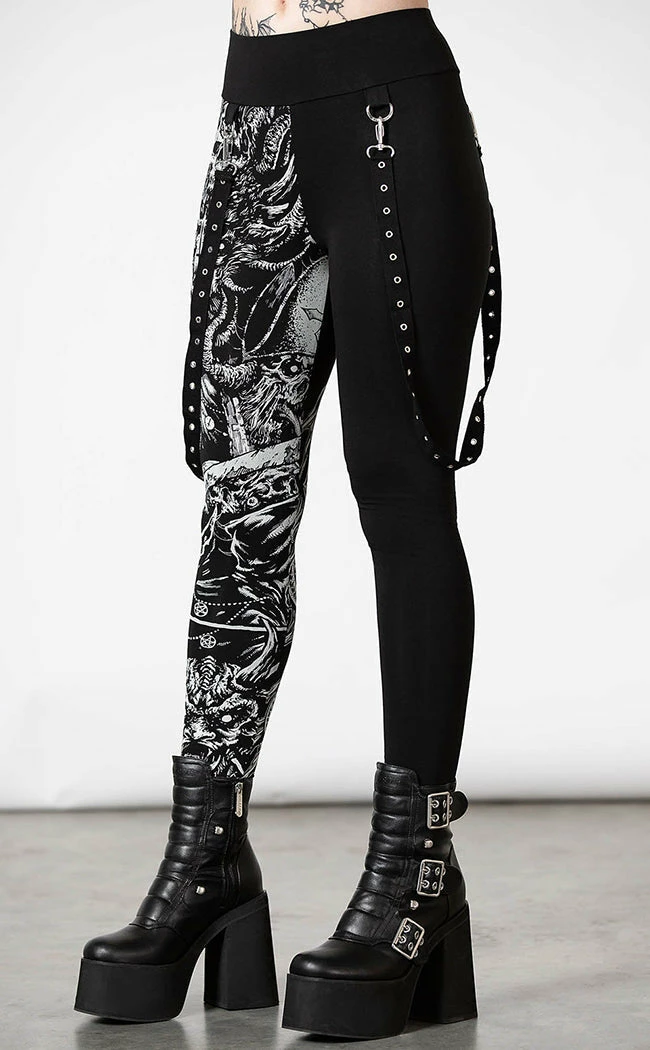 Blow their minds with the Amnesia Leggings! Soft, stretch cotton forms these close-fitting leggings, featuring aΒ statement contrast print completely covering one leg. The leggings sit high on the waist with a wide waistband and also feature detachable, multiway bondage straps.Β