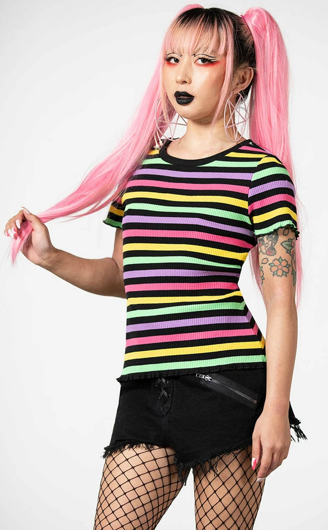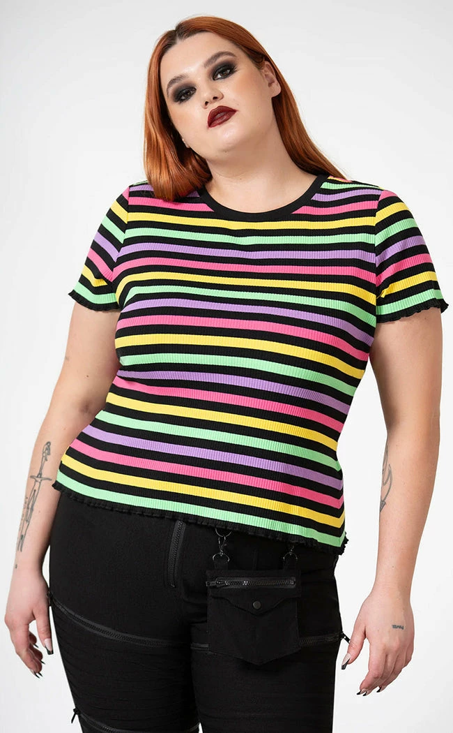Show yer true colours in the BlairΒ Rainbow Top!Β Β Soft, stretch cotton fabric is ribbed for your pleasure, coloured in every shade of the goth rainbow and shaped into a cute round neck tee with a lettuce hem. A versatile stylin’ piece for every occasion!