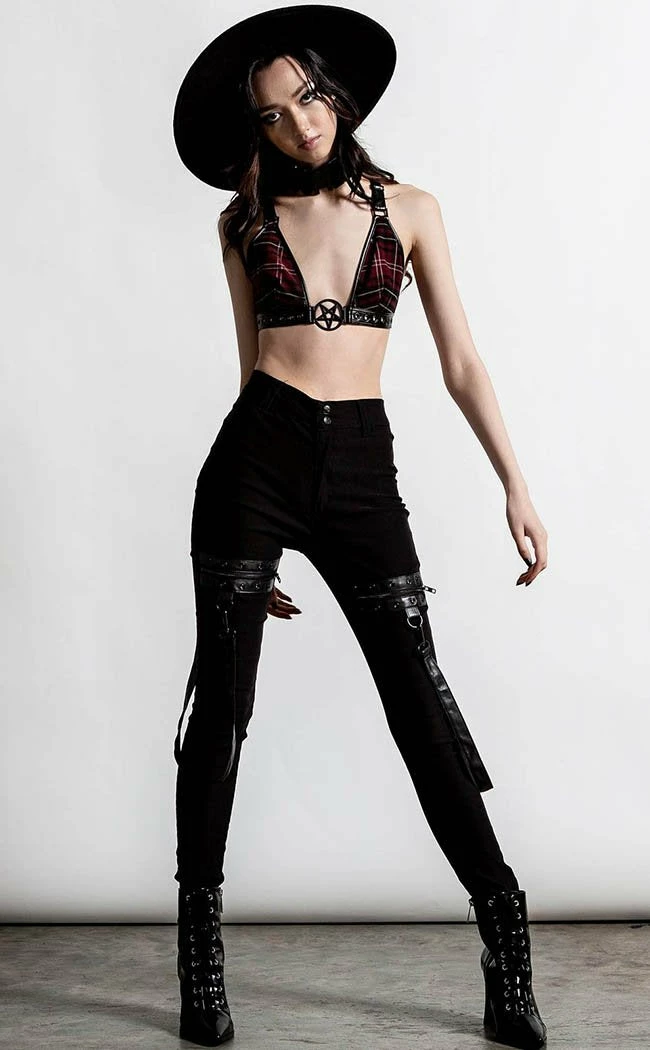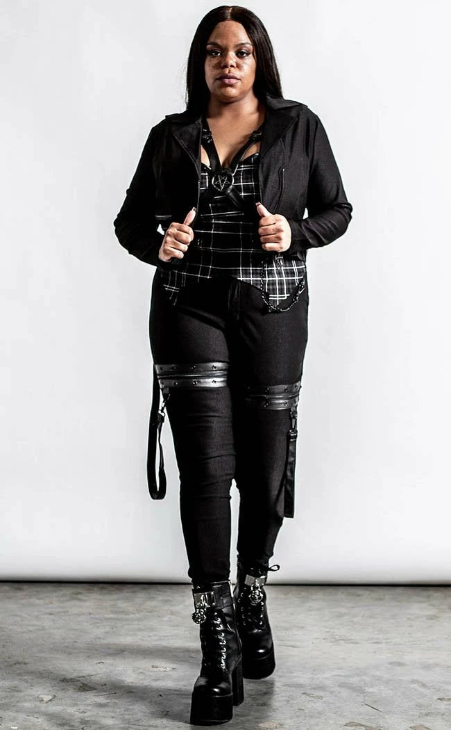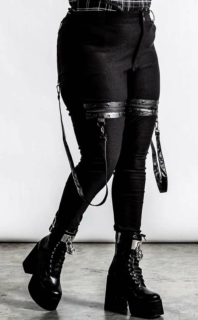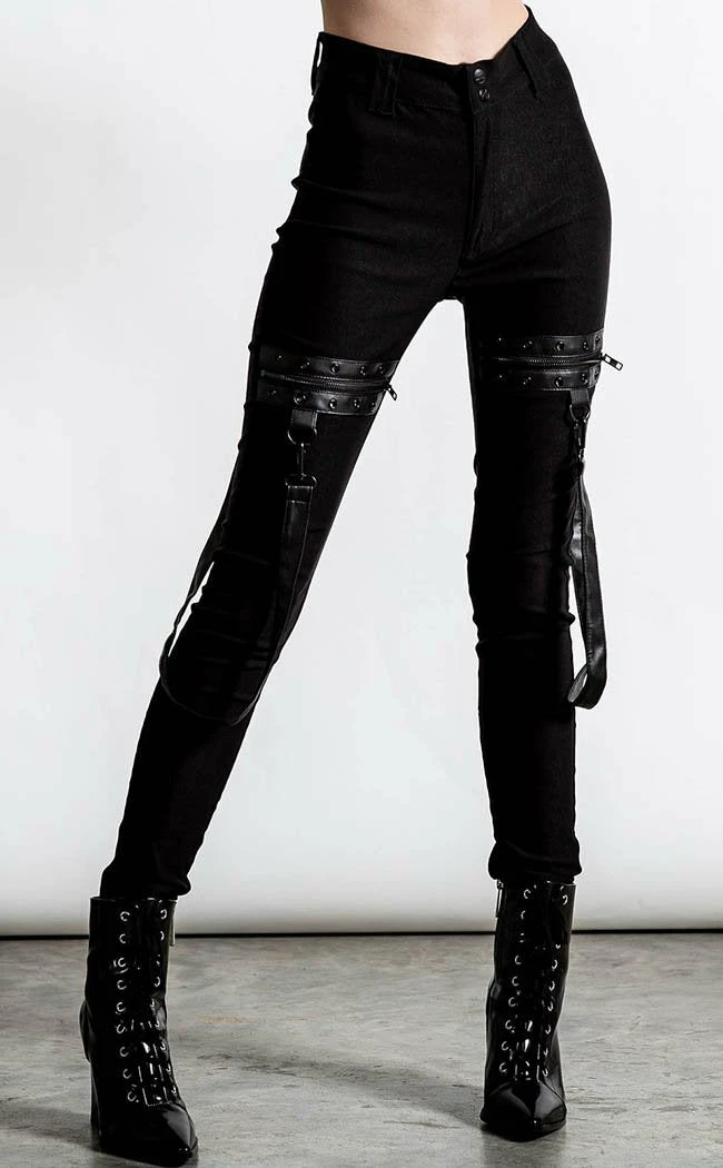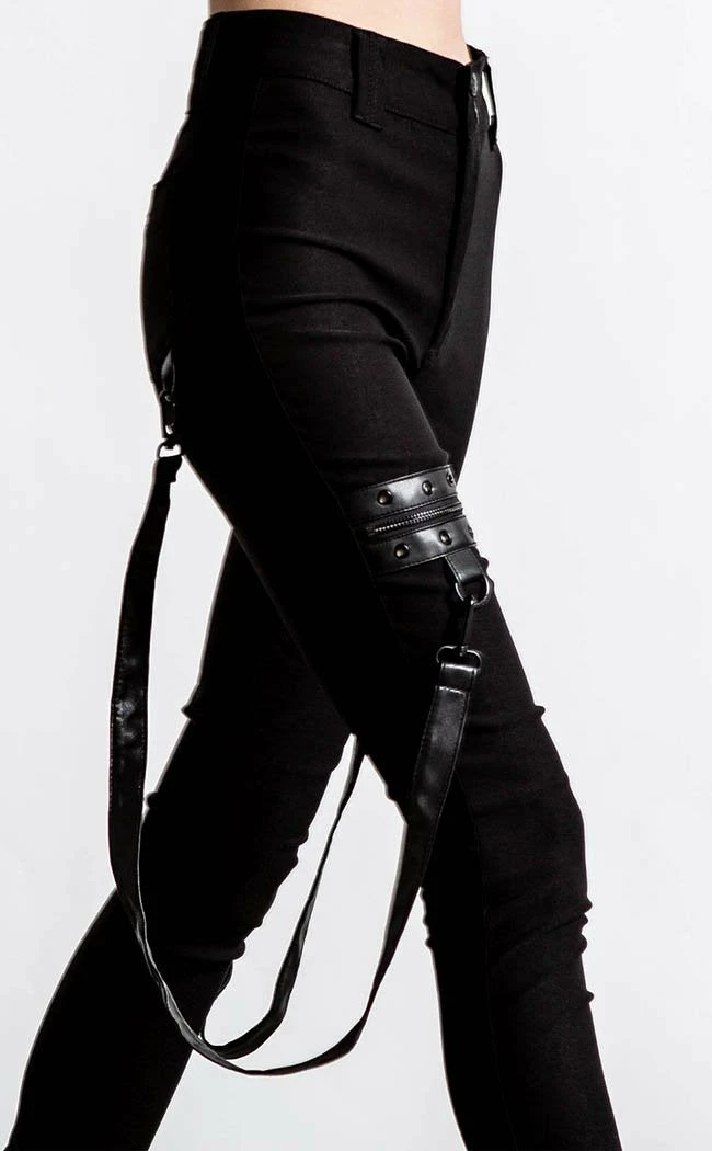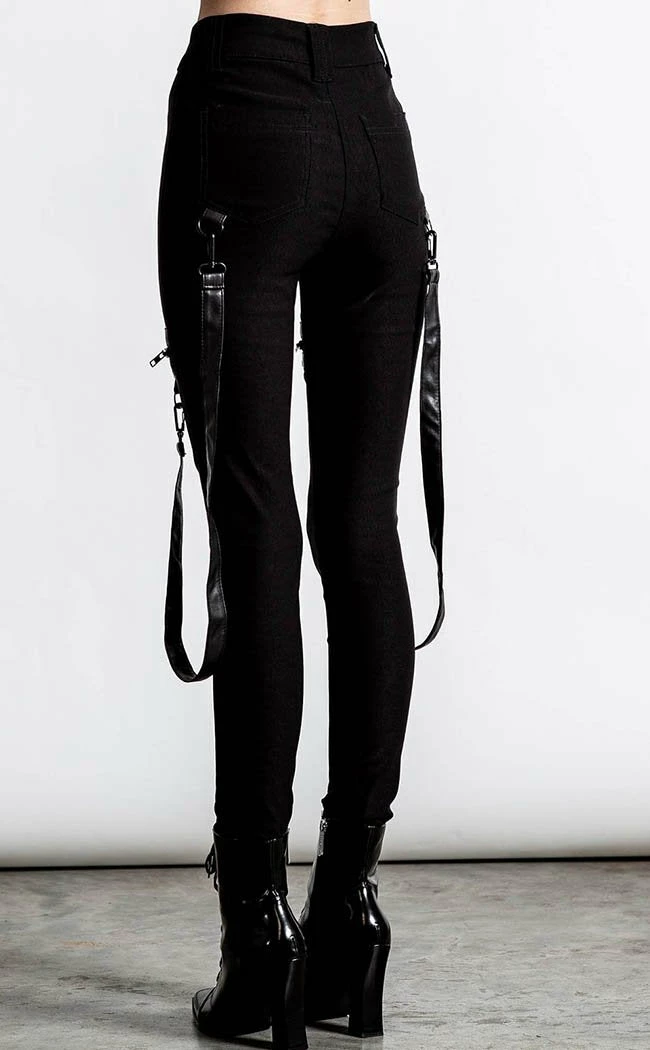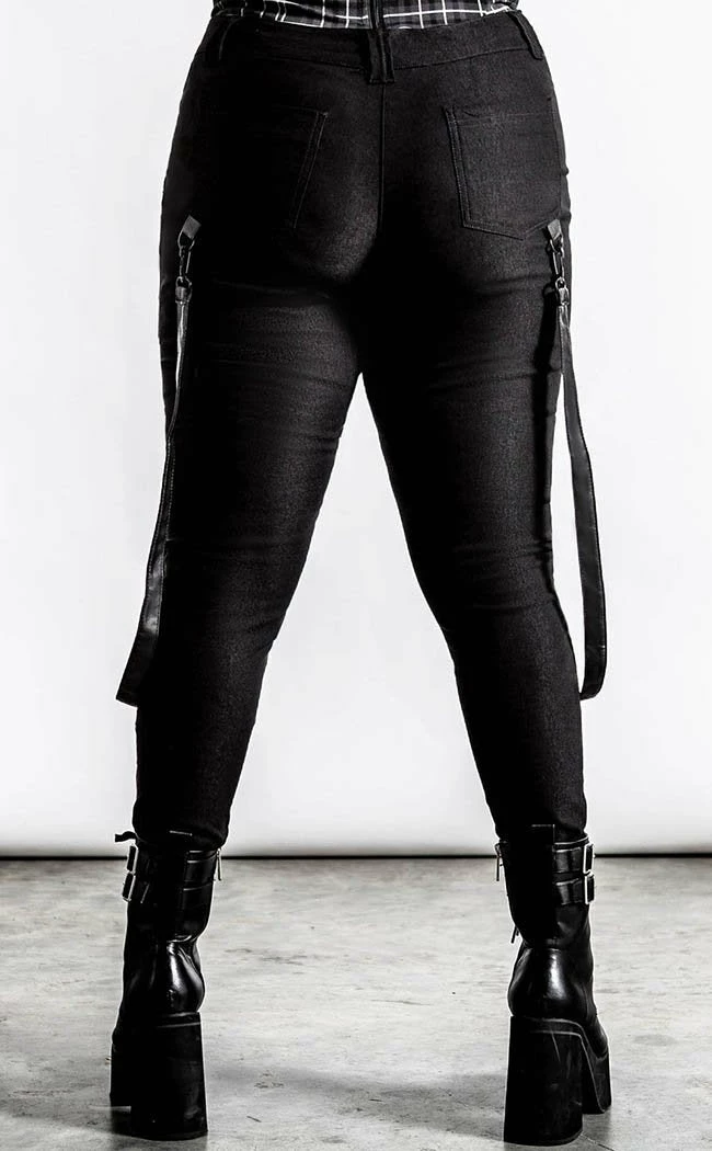 These ain’t yerΒ basicΒ skinny jeans!Β Super stretchy, super cosy and super rockin’, these pitch blackΒ teasers come with statement strapsΒ and zip n rivetΒ details on the thighs for a deadly flair.