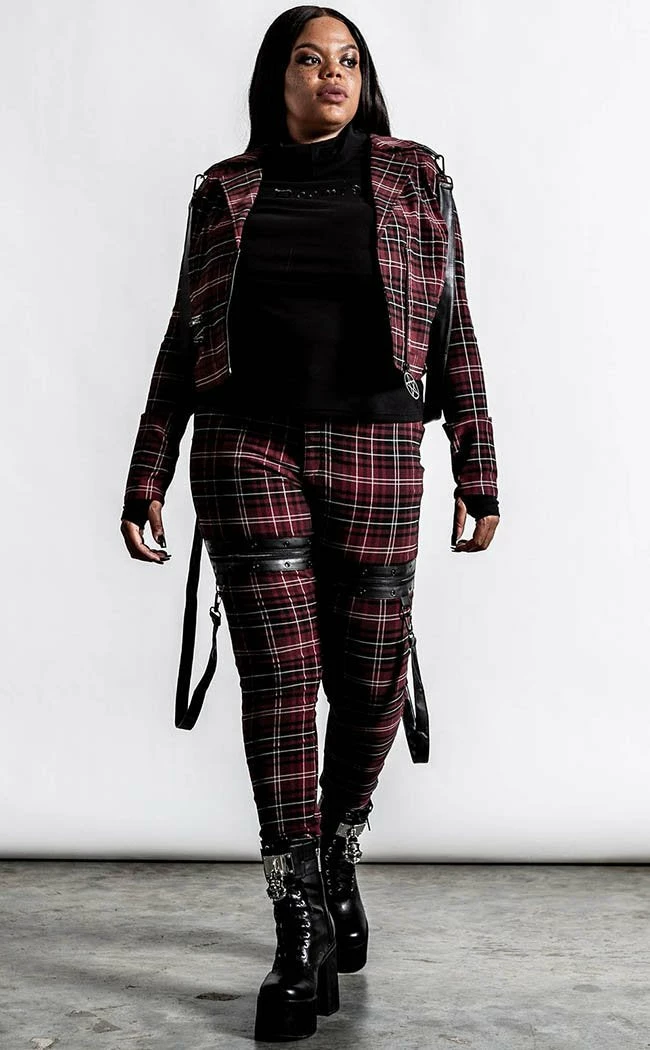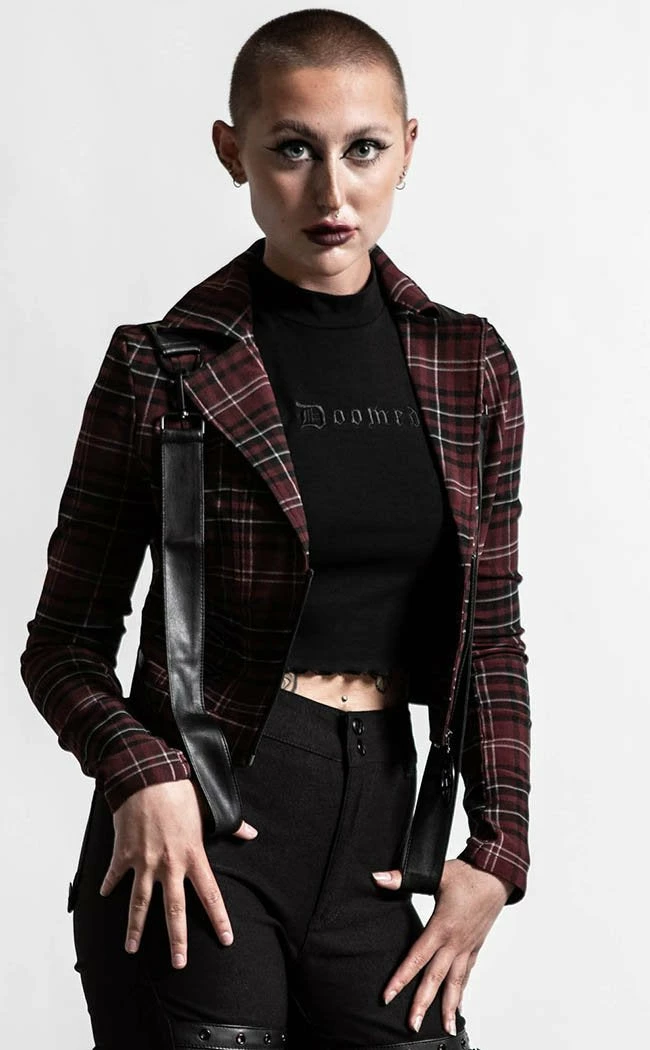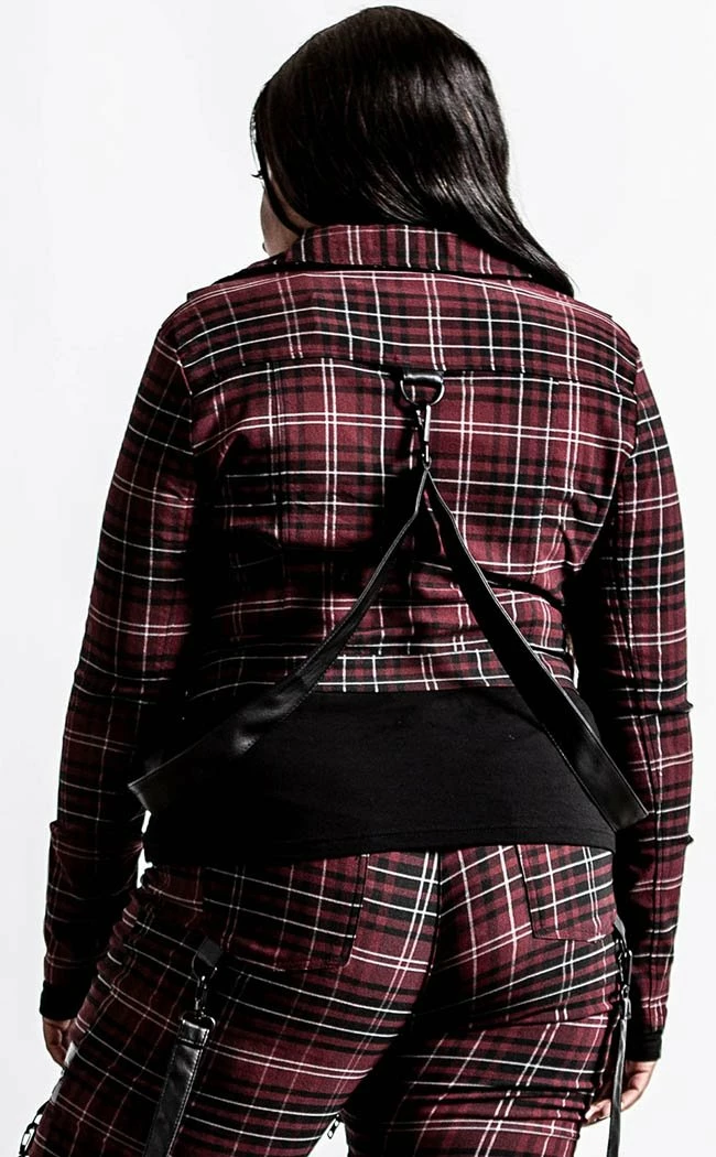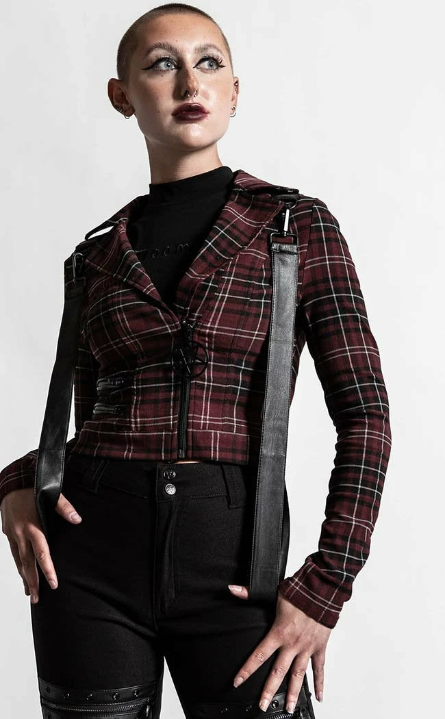 Let it fly in this classy yet kickass jacket!Β The length is cropped and removable statement straps wind from the back to the shoulders.Β The front zips up with a chunky pentagram charm to keep you warm with the passion that burns within.