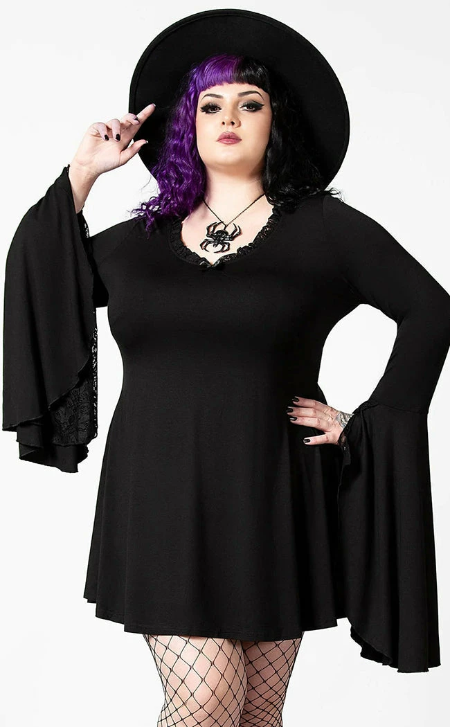 Revel in your own power in the Hagatha Sorceress Dress! Soft, stretch fabric forms this beautiful dress, featuring a V neckline, dramatic bell sleeves with lace panelling, an A-line silhouette and a ruffled neckline.