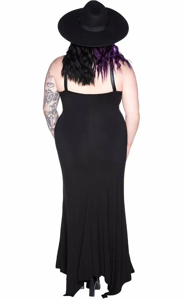 Effortless chic is the name f this sinners game-a harness chest connects to the shoulder straps of this maxi, the material soft and slinky to flow down your bod. The skirt ends in a hanky hem like tendrils of darkness circling your ankles as you stomp the streets.