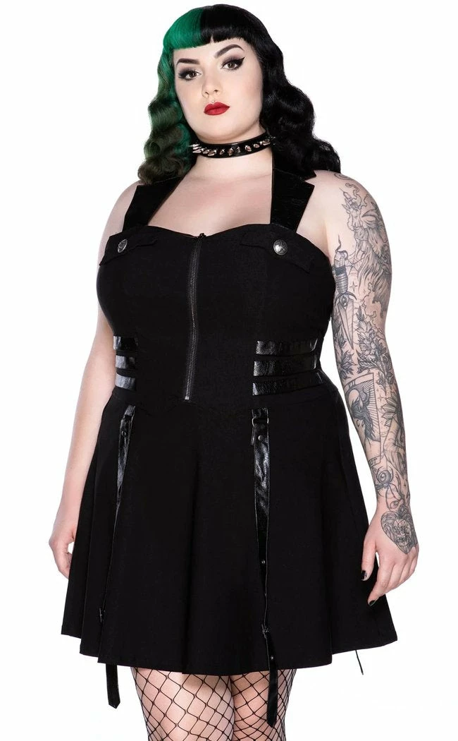 Dress like the futuristic intergalactic goddess you are in the Psy-Ops Halter Dress! This dress is constructed of super-stretch woven fabric for a fantastic fit, cute af pleated skirt and zip and pocket accents. The badass halter neck, straps, buckles and statement front zip will have you looking sexy and space-aged.