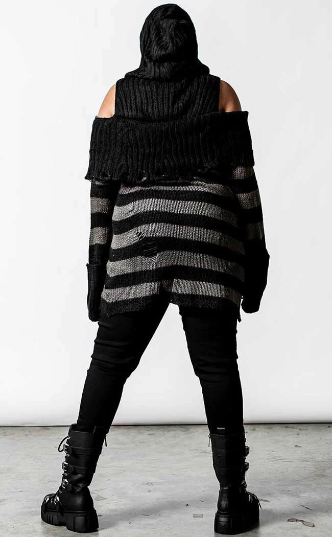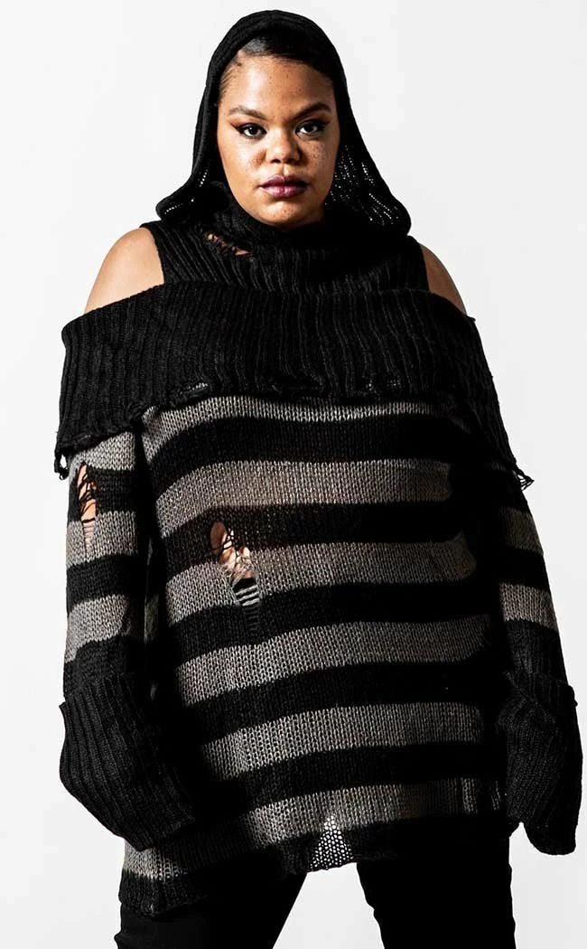 Get snug inΒ deathly stripes with the Shallow Grave Hooded Knit Sweater. Super soft and totally vegan, this knit wraps you in a statement bardot neckline and cosy hood. TheΒ grey and black stripes feature shredded details to get ya feeling extra badass, fitting over yer bod in effortless warmth and style.Β