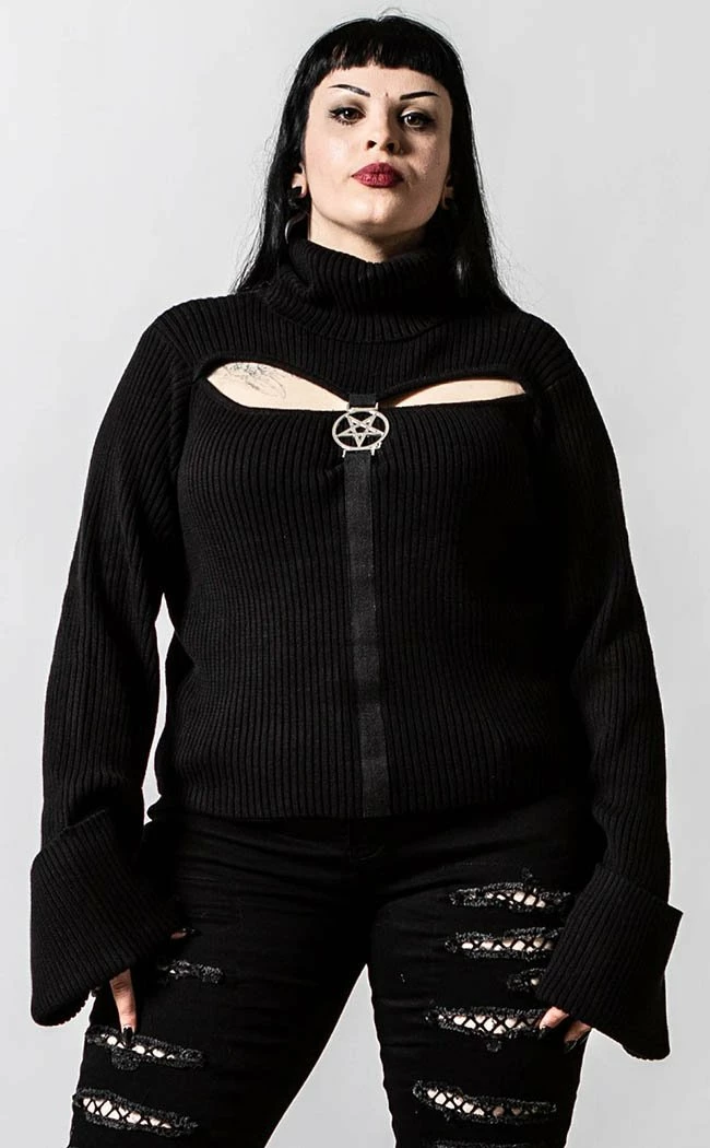 Blackened threads to soothe your dark soul.Β This sweater is made with a super soft knit, keeping you snug with a high neck and super long sleeves.Β The statement chest cutout is accentuated by a pentagram charm so you can keep it spooky even through the winter chill.Β Β