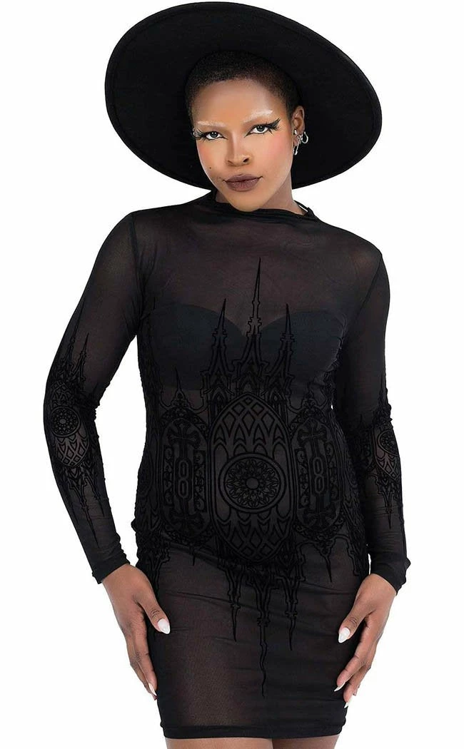This super stretchy bodycon dress is printed with an intricate motif reminiscent of crumbling cathedral windows. With long sleeves and a high neckline, this baby looks amazing over slips, lingerie and especially your bad bod.