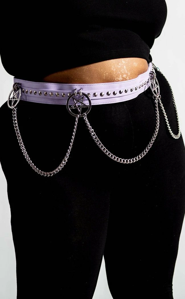 Get in on the drama with this xxxtra belt!Β The thick double layer of vegan leather is studded all the way to hell.Β Pentagram charms and chains drape from the centre in its crowning glory.