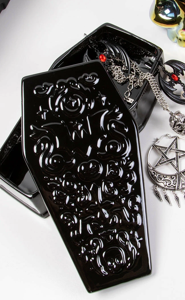 Put yer trinkets to rest in the Daemon Coffin Box! Made with sleek black ceramic, the lid is embossed with intricate gothic designs and opens to reveal plenty of space for yer jewellery, trinkets and bones.