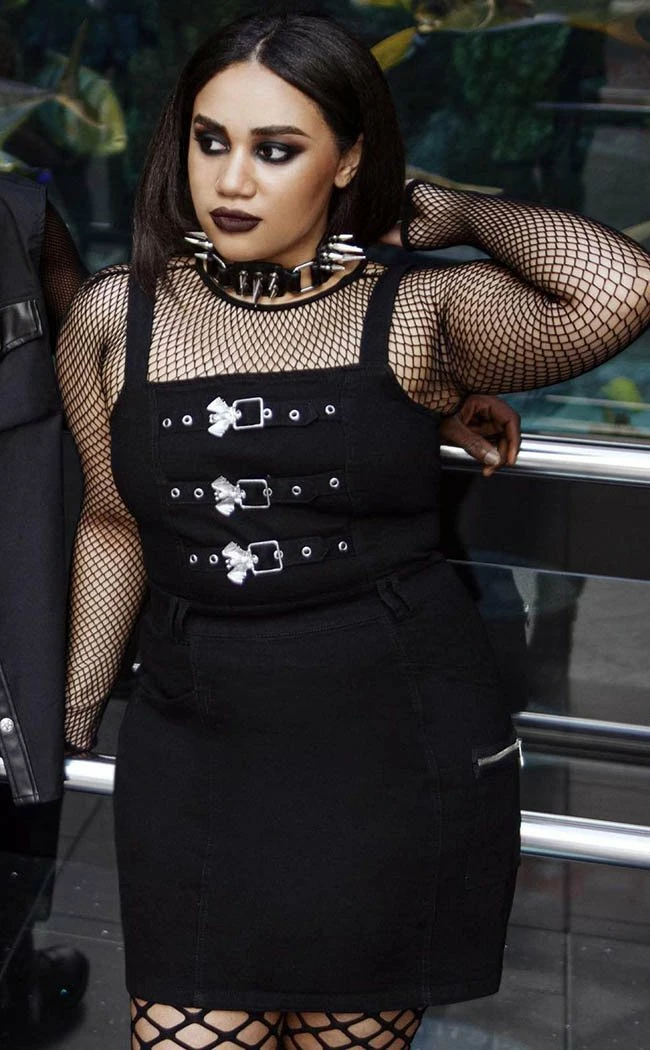 This dress is a gothy dream-a super flattering mini fit with thick shoulder straps, zip details and *gasp* batty buckles!!!!