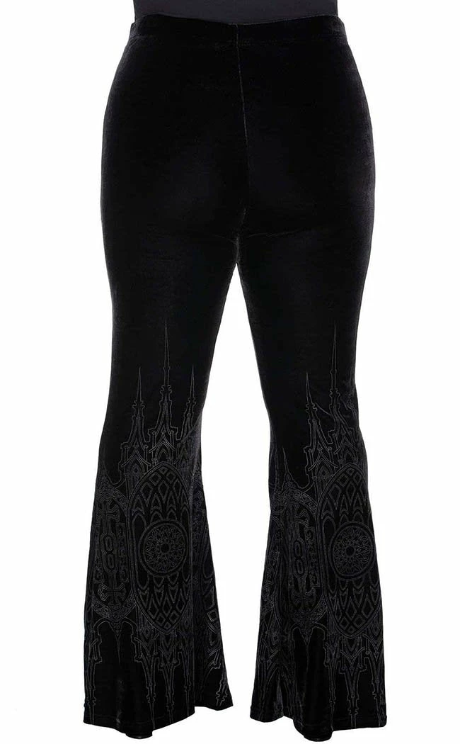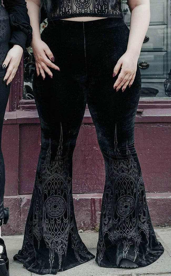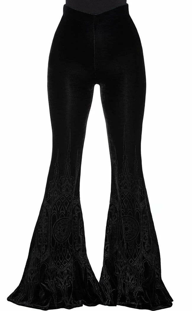These flares are all decked out in luxe velvet and a cathedralΒ window motif for a classy retro look.Β these babies are loooong so you’d best wear them with your fave platforms to get the most outta that swish!